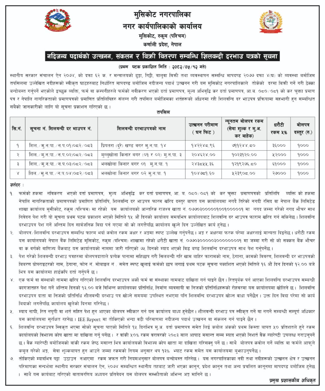 नदि जन्य पदार्थ उत्खन्त, संकलन तथा विक्रि वितरण सम्बन्धि शिलबन्दि दरभाउ पत्रको सुचना